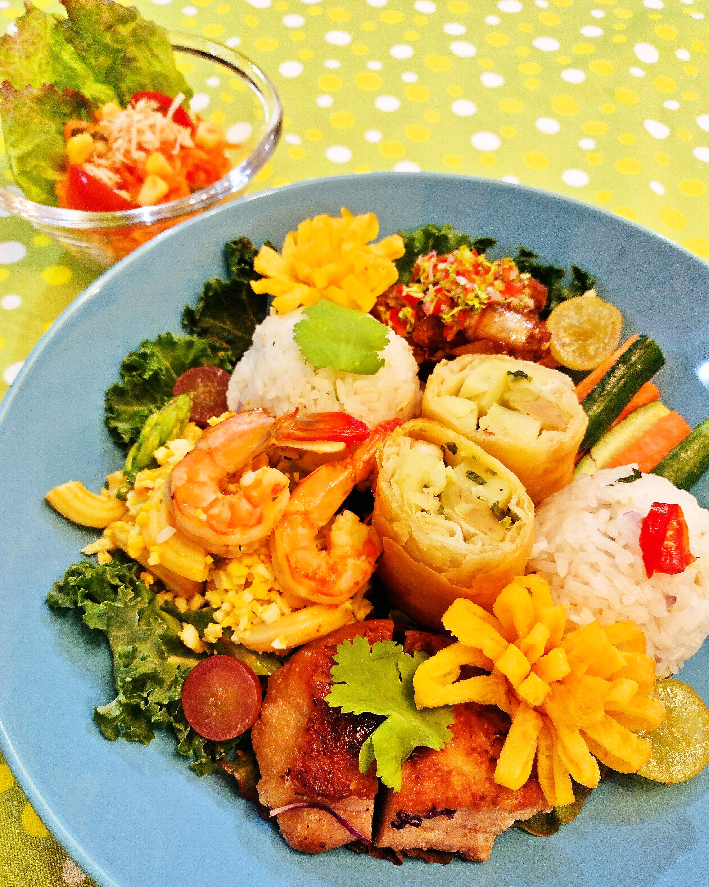 "Kafe Ayam Special Ohanami Bento" is packed with balinese sweet&spicy pork,shrimp mimosasalad,potato&avocado&octopus springroll,carottes râpées thai style,dandelion egg, gai yaan(Thai style chicken saute), Indonesian pickles,thai flover riceball.
